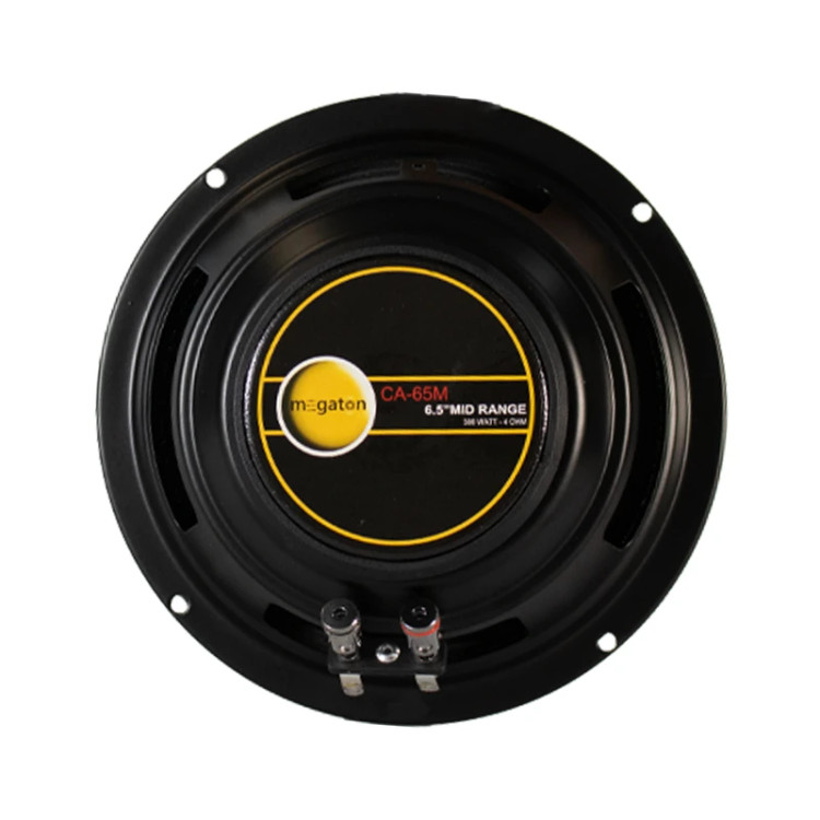 این محصول دارای بولت آلومینیومی بوده و به همین دلیل می توان گفت که شما می توانید مدت زمان بسیار بیشتری از این محصول استفاده کنید؛ در صورتی که فشار زیادی به محصول وارد نمی شود. به دلیل اینکه این محصول دارای بولت آلومینیومی هستش، بولت آن از ورود گرد و غبار نیز جلوگیری کرده و از آسیب رسیدن به سیم پیچ میدرنج جلوگیری می کند. جنس صفحه دیافراگم این میدرنج از نوع کاغذی هستش که به صورت یک تیکه با سوراند آن پرس شده است؛ یکی از دلایلی که می توان گفت توی حجم و پرتاب صدای این محصول موثر هستش صفحه کاغذی آن است. ترمنیال هایی که برای این میدرنج استفاده شده است، از بهترین نوع ترمینال بوده که آن را فشاری یا مکانیکی می نامند و شما می توانید راحت ترین، ساده ترین و بهترین اتصال را با این ترمنیال داشته باشید. میدرنج 6 اینچ مگاتون مدل CA-65M دارای توان حداکثری برابر با 300 وات MAX و توان حقیقی برابر با 130 وات RMS می باشد که به دلیل سنسیویتی بالایی که دارد، به راحتی با هر آمپلی فایری که بالای 50 آرامس است، راه اندازی می شود. برای جلوگیری از آسیب دیدن صفحه این محصول یک جفت قاب فلزی زیبا و جذاب نیز در داخل بسته بندی محصول در نظر گرفته شده است که می توانید آن را بر روی میدرنج ها نصب کنید. همچنین برای جلوگیری از شکستگی و آسیب دیدن مگنت این محصول واشر لاستیک در نظر گرفته شده است.
