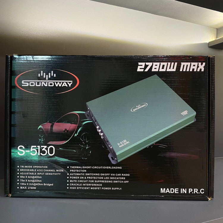 آمپلی فایر ساند وی مدل S-5130: توان خروجی(RMS) این آمپلی فایر در 4 اهم 50 وات، در 2 اهم 75 وات، در حالت پل در 4 اهم 150 وات و حداکثر توان خروجی آن 2780 وات می باشد. از ویژگ های این آمپلی فایر می توان به عملکرد سه حالته، حالت ۴/۳/۲ کاناله قابل پل زدن، حساسیت ورودی قابل تنظیم، محافظت حرارتی/اتصال کوتاه/اضافه بار، روشن/خاموش کردن خودکار از طریق رادیو ماشین، نشانگرهای LED روشن و محافظ، مدار بیصدا برای جلوگیری از خاموش شدن، تداخل صدا و منبع تغذیه ماسفت با راندمان بالا اشاره کرد.