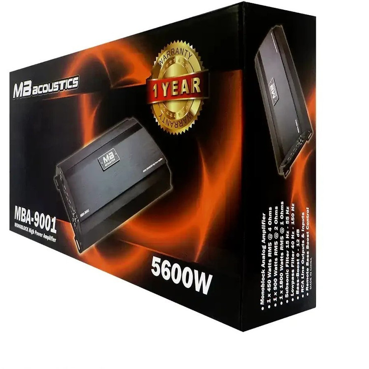 آمپلی فایر 9001 ام بی آکوستیک : پیش از این آمپلی فایر های 2 کانال و 4 کانالش شرکت ام بی, بعلت داشتن توان بسیار بالا طرفداران بسیاری را در بین سیستم بازان پیدا کردند. آمپلی فایر 9001 ام بی آکوستیک تقریبا توانی برابر با آمپلی فایر سابق جی بی ال مدل 601 دارد. قابلیت راه اندازی 2 عدد ساب قدرتمند را براحتی دارا می باشد. سابهای 1214 و 1200 و 122 جی بی ال، 3010، 3017 و 3015 و 3016 کنوود و همچنین 1270 و 1200 اینفینیتی و 311S4 و و 312S4 و 312D4 300S4 پایونیر و 121 و 122 سونی از جمله سابهایی هستند که بصورت جفت می توان برای این آمپلی فایر استفاده کرد. همچنین سابهای دابل مگنت نیز براحتی با این آمپلی فایر قابل راه انداری هستند. (این آمپلی فایر با توجه به اینکه مونو می باشد تنها در کنار ساب ووفر کاربرد دارد). تنظیمات این آمپلی فایر بالاتر از آمپلی فایرهای مونو دیگر شرکتها در این رنج قیمتی می باشد و کیفیت نسبتاً قابل قبولی به شما میدهد.