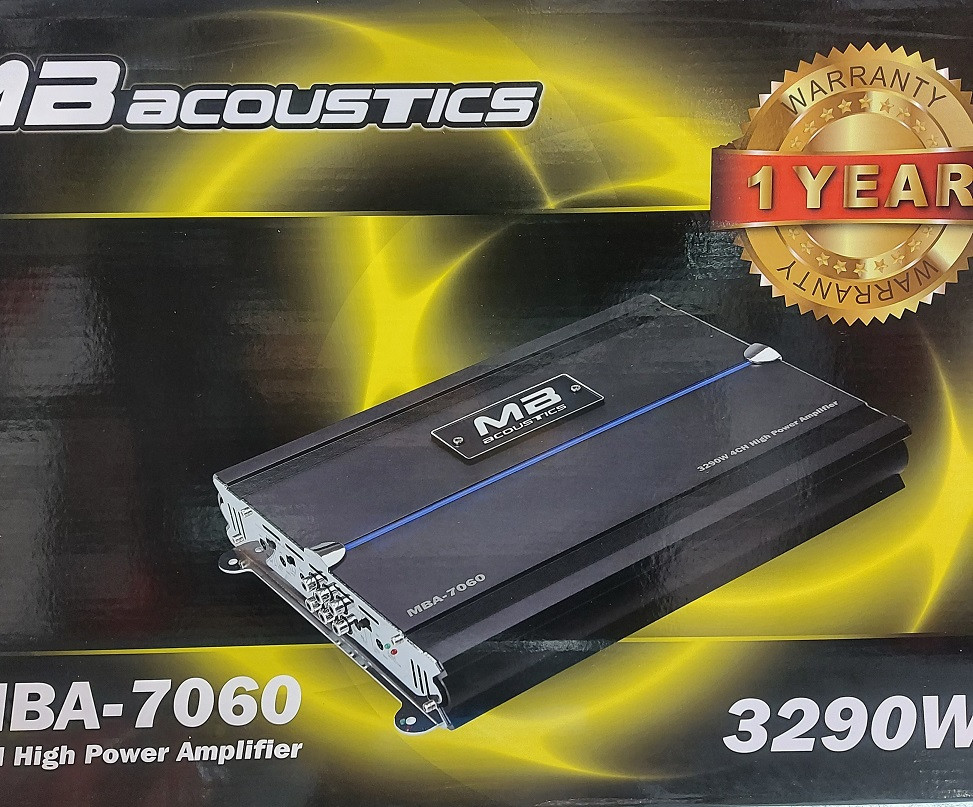 آمپلی فایر 7060 ام بی آکوستیک محصول جدید ومیانرده این شرکت است. این آمپلی فایر نیز مانند آمپلی فایر های دیگه قابلیت راه اندازی ساب ووفر همراه باند را دارد. ویژگی اصلی آن برق نسبتا کنترل شده است که باعث می شود نیروی کمتری از باطری ماشین کشیده شود تا صدمه ای به باطری ماشین وارد نشود. آمپلی فایر 7060 قدرت راه اندازی سابهای مانند 3010 کنوود و یا 1000 جی بی ال و 311 پایونیر و 121 سونی را دارد و با قیمت مناسب یکی از بهترین گزینه های ممکن در نوع خودش می باشد.