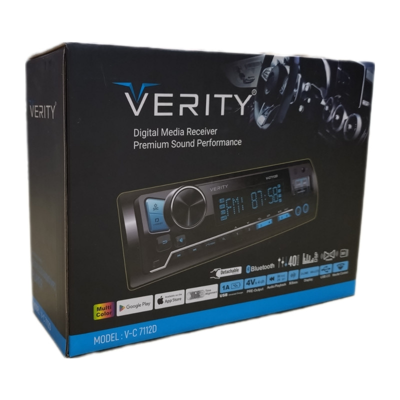 رادیوپخش خودرو وریتی مدل 7112D قابلیت: USB-CHARGE-AUX IN-RADIO-BLUETOOTH-TF CARD را دارد. دارای ریموت کنترل و اپ کنترل قابل نصب بر روی گوشی هوشمند می باشد. میکروفون بلوتوث داخلی دارد و در صورت تمایل میتوان میکروفون جداگانه تهیه و اضافه نمود.